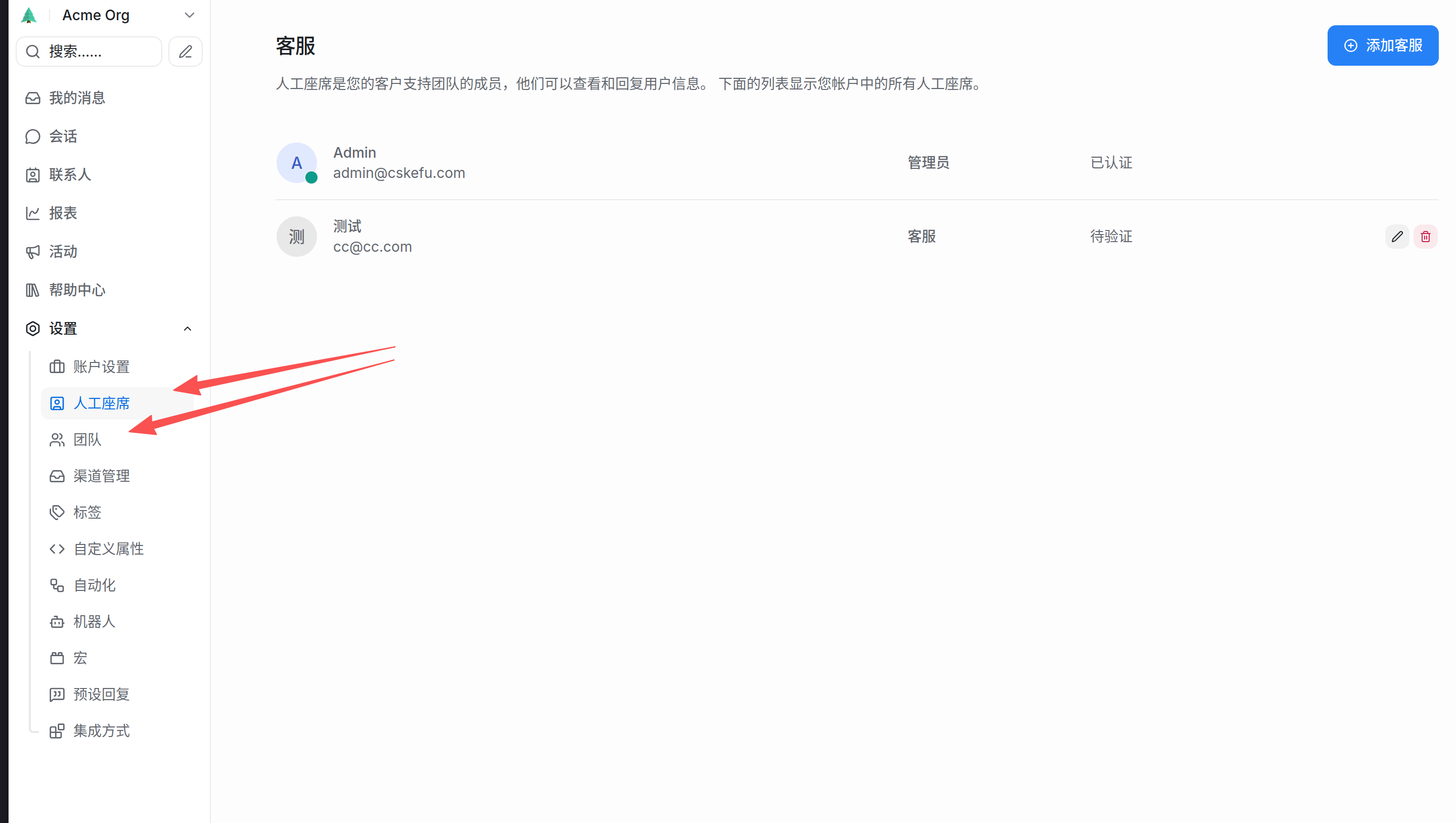 Add Agent,输入对方邮箱并分配角色。系统会发送一封激活邮件。 - 编辑/删除: 你可以随时更改某个成员的角色,或者在人员离职时将其删除(删除后,其历史回复记录仍会保留,但不再占用席位)。