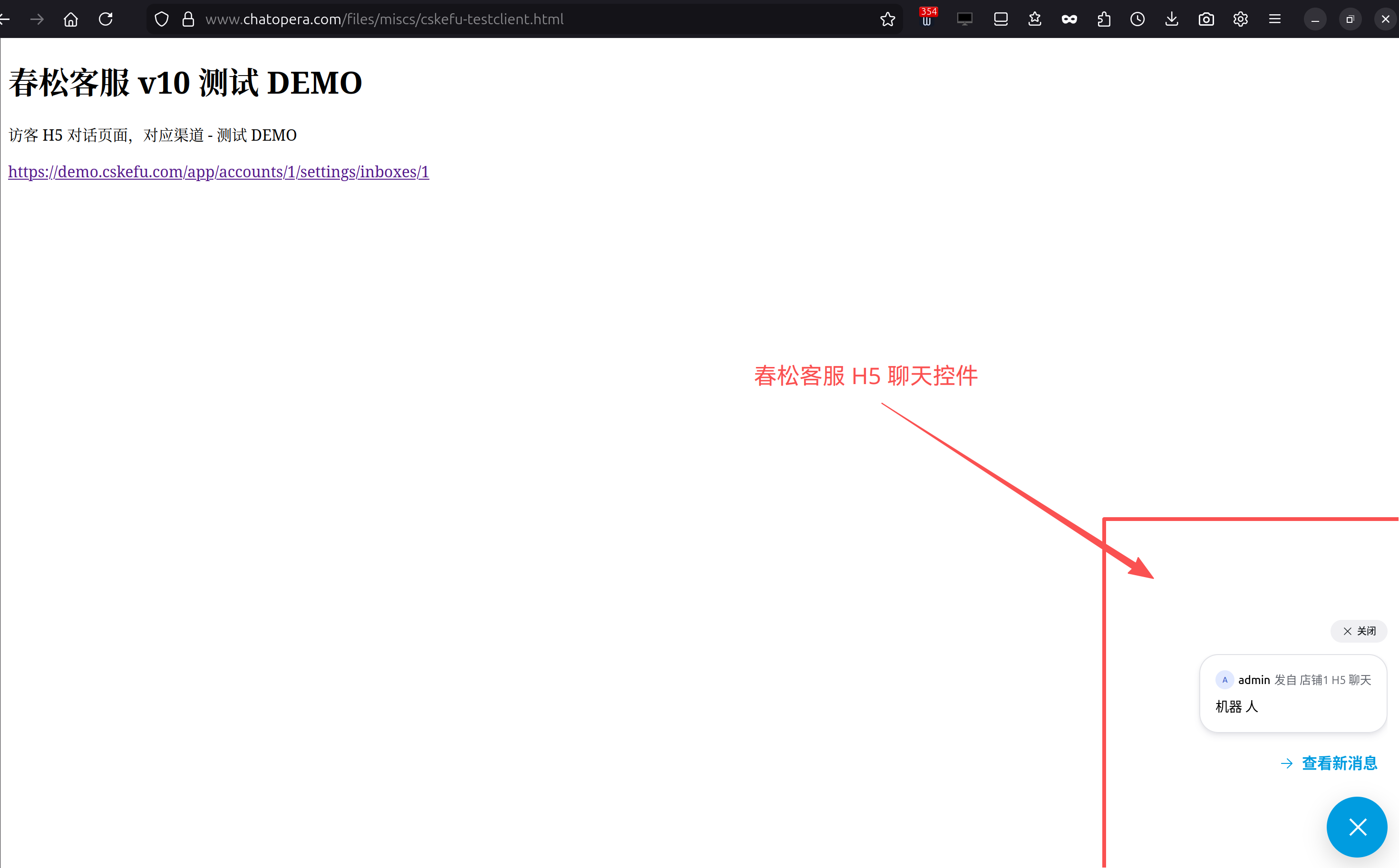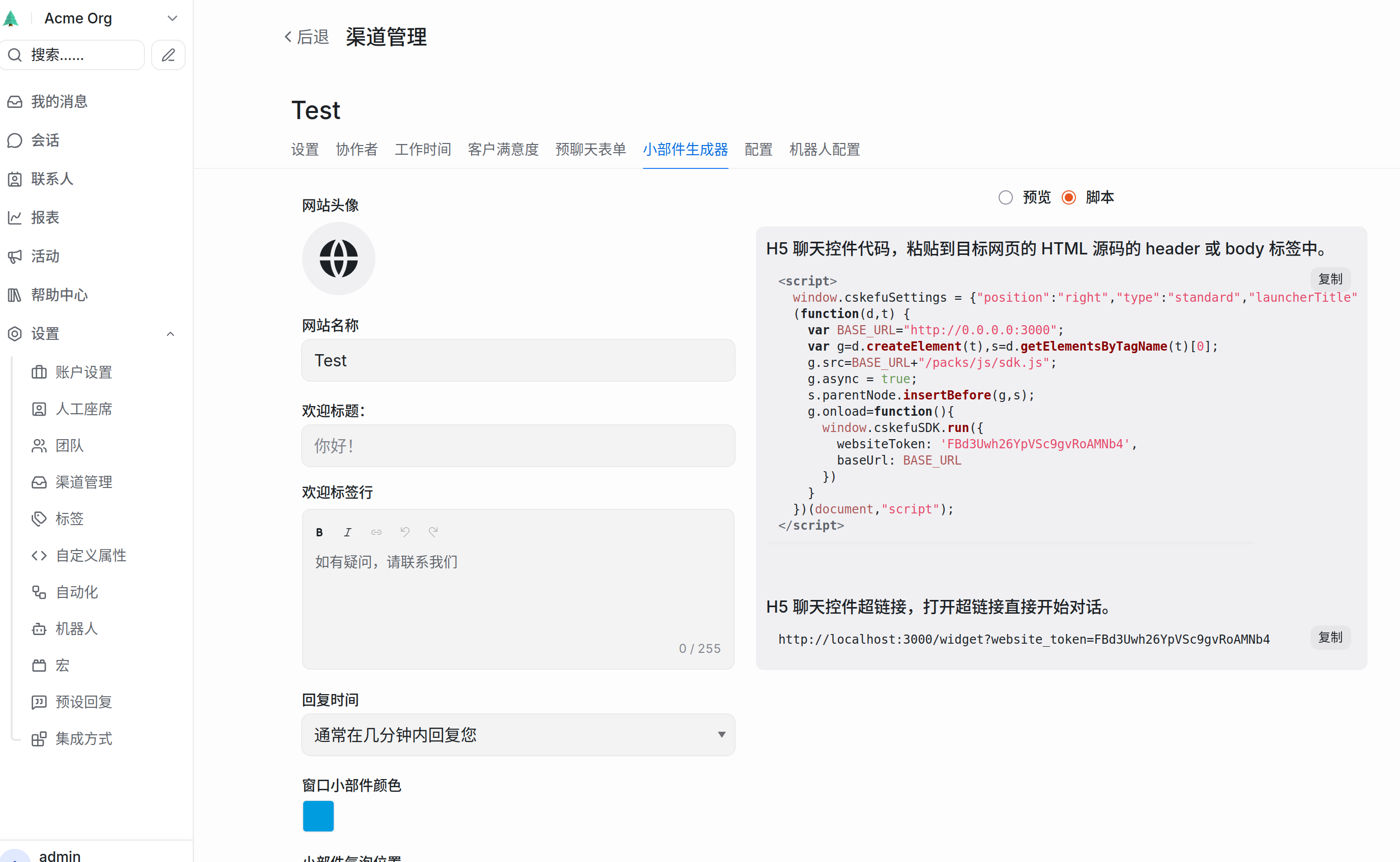 在春松客服后台创建“网页收件箱”后,系统会生成一段类似下方的 JavaScript 代码: