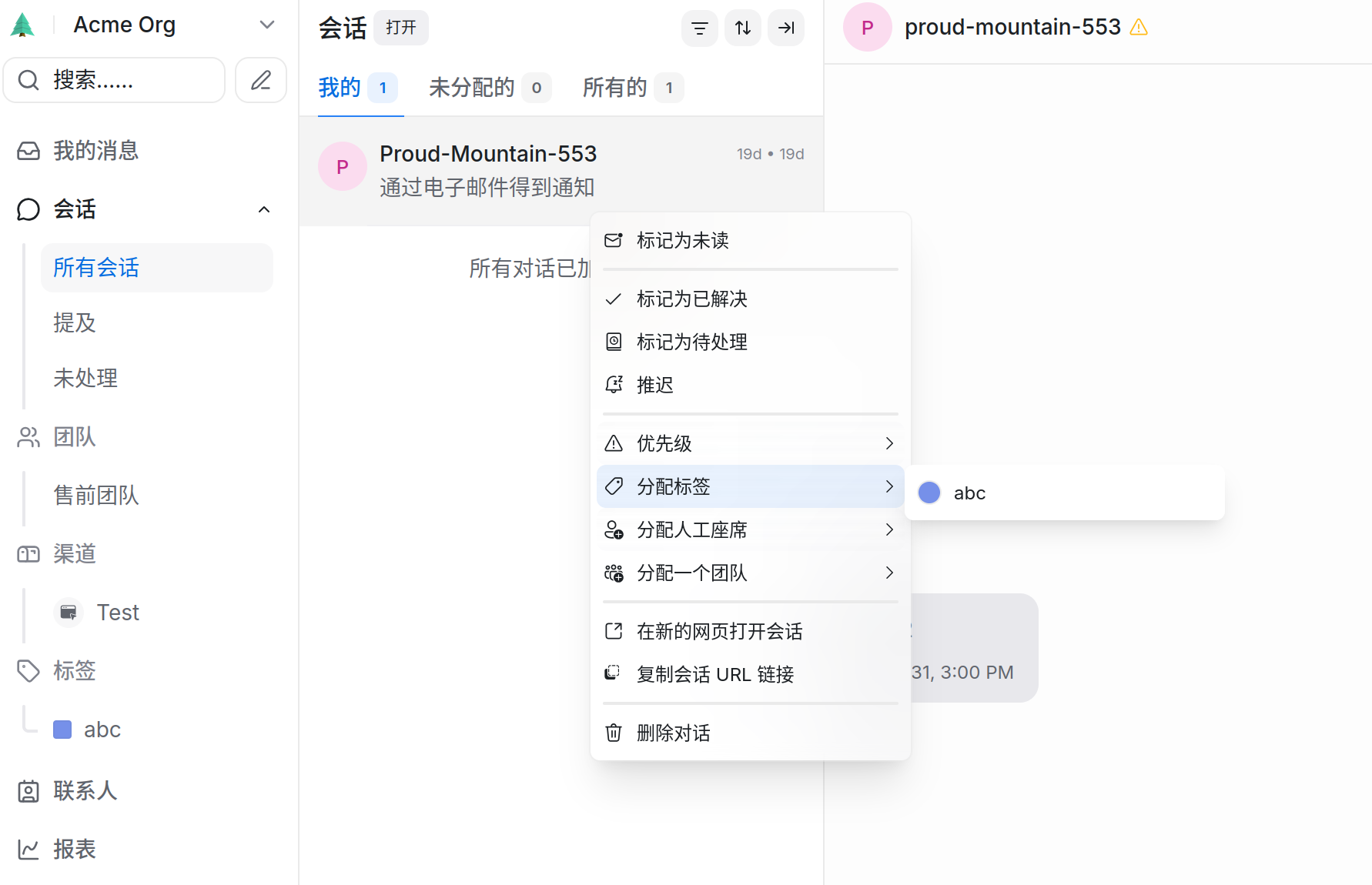 在处理对话时,客服可以在右侧边栏的“标签”区域直接搜索并添加。这是最常用的方式,用于客服对当前问题进行归类。
