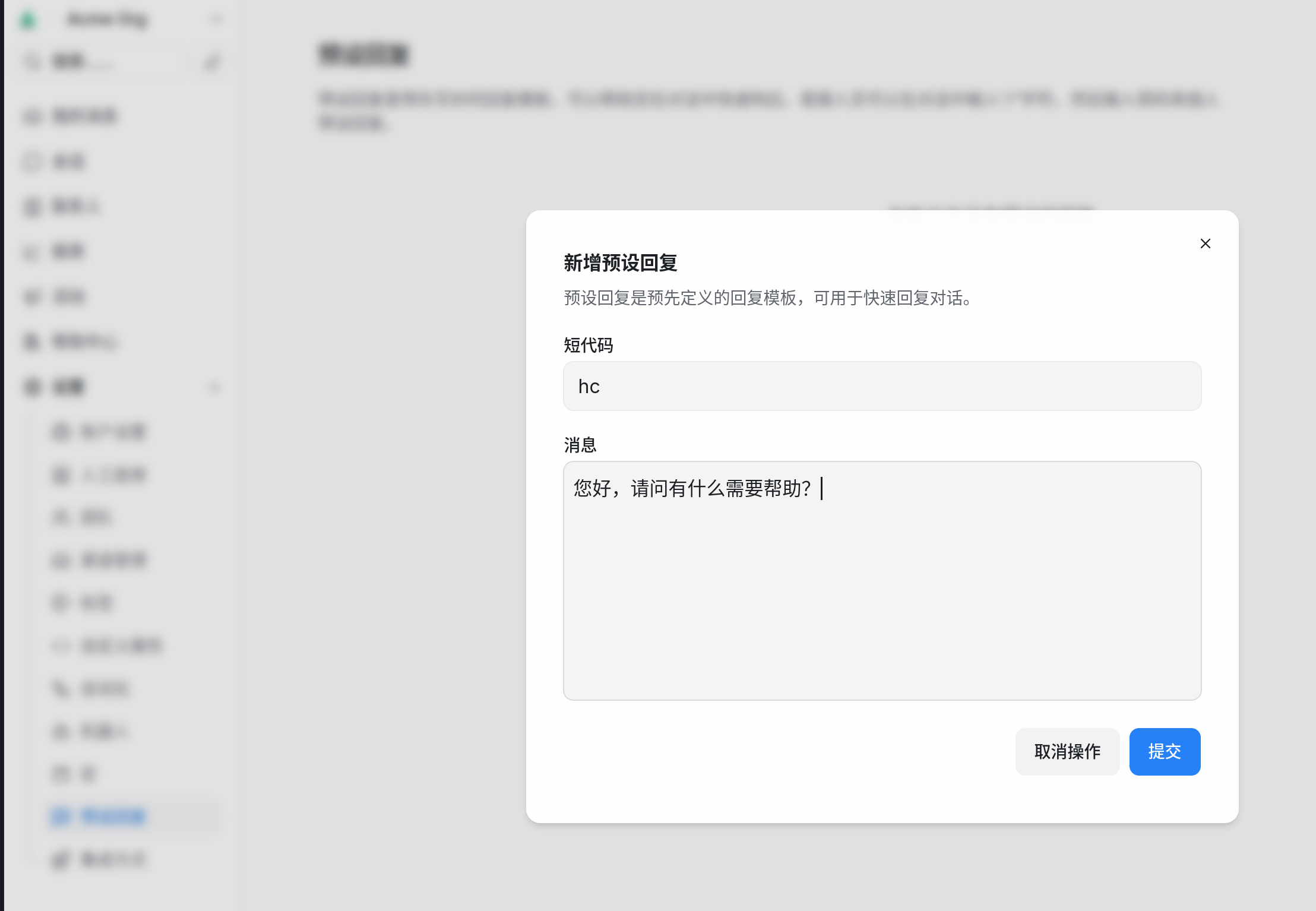 添加预设回复 (Add Canned Response)。- 快捷简码 (Short Code): 设置一个好记的缩写(例如