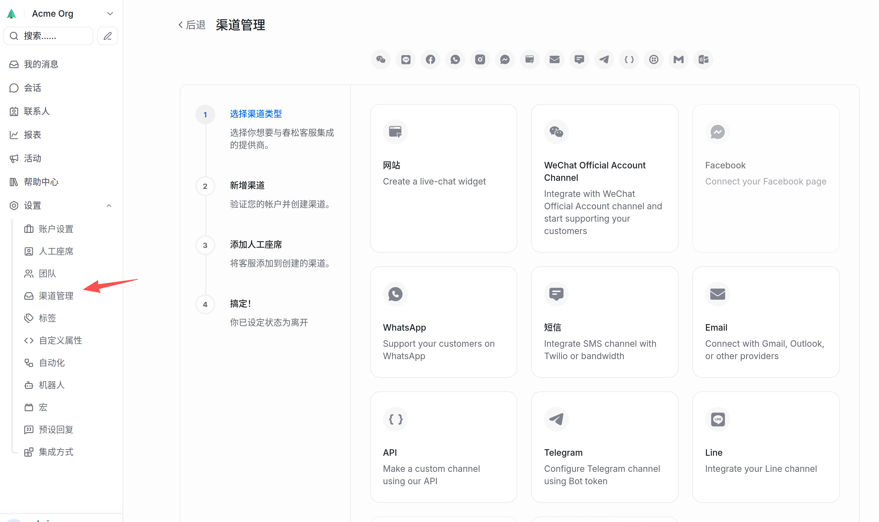 设置 (Settings)->渠道 (Inboxes)->添加收件箱 (Add Inbox)。 - 常用渠道配置: