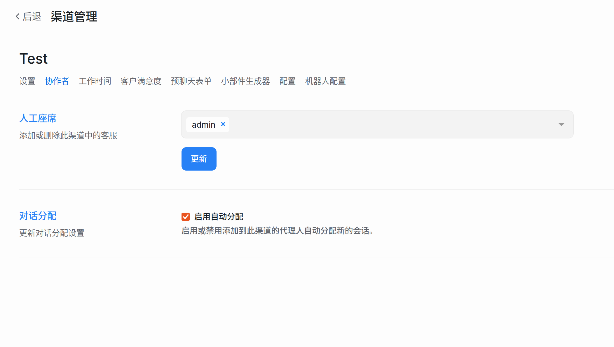 - 分配坐席: 选择哪些坐席有权查看并回复这个网页渠道的消息。
