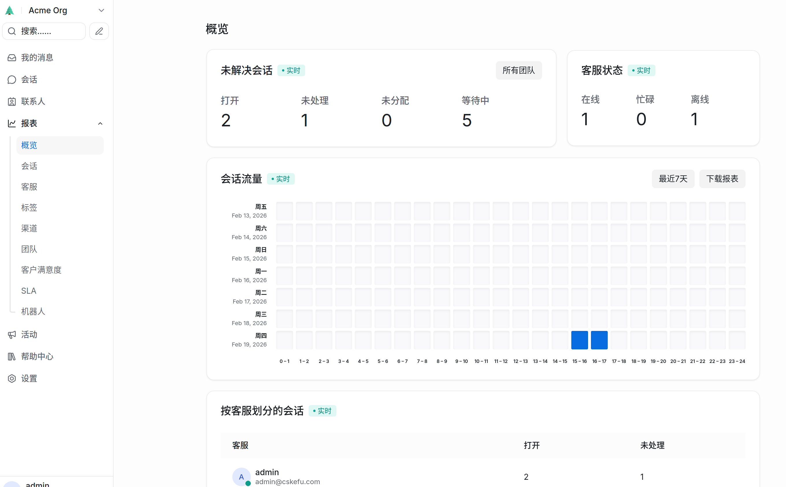 - 满意度调查 (CSAT): 如果开启了评价功能,在这里可以看到客户对服务的评分分布(1-5星)。