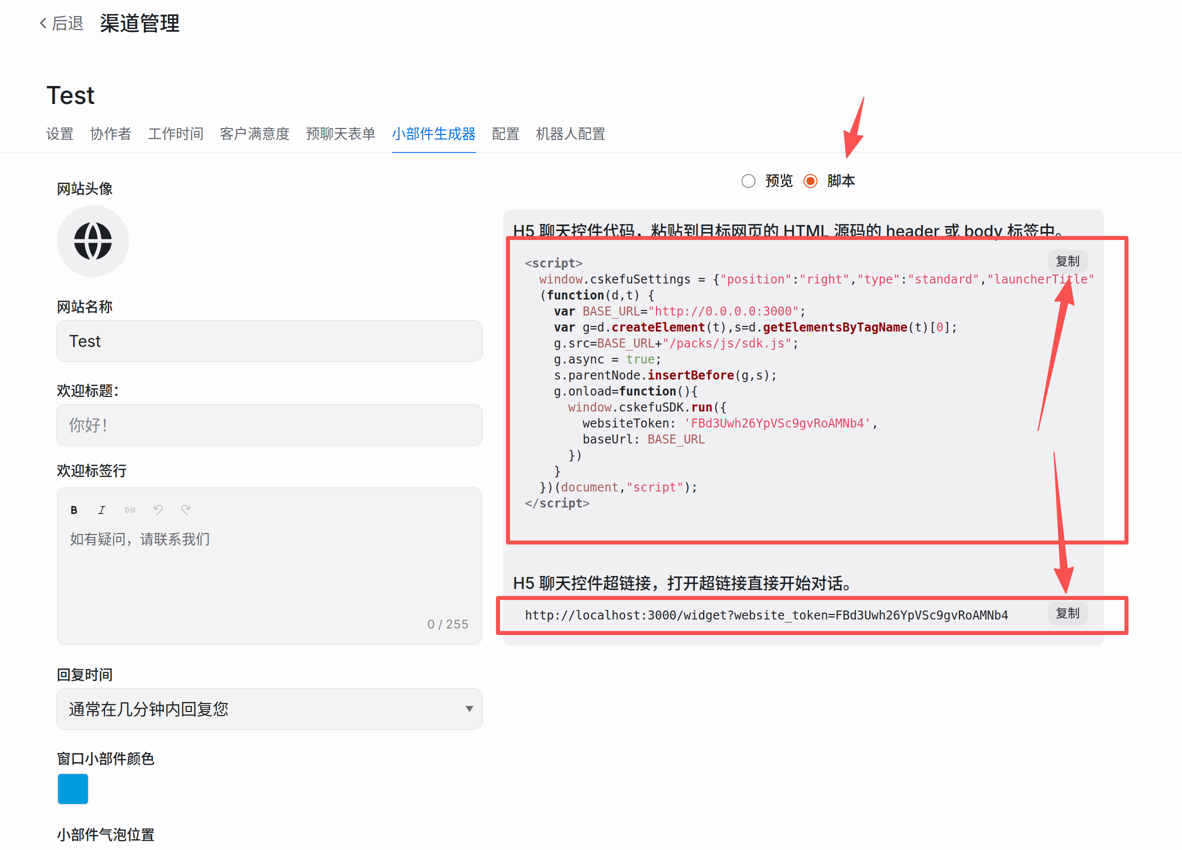 - 小部件设置: 自定义外观颜色、欢迎语(如“您好,请问有什么可以帮您?”)以及是否启用预聊天表单。