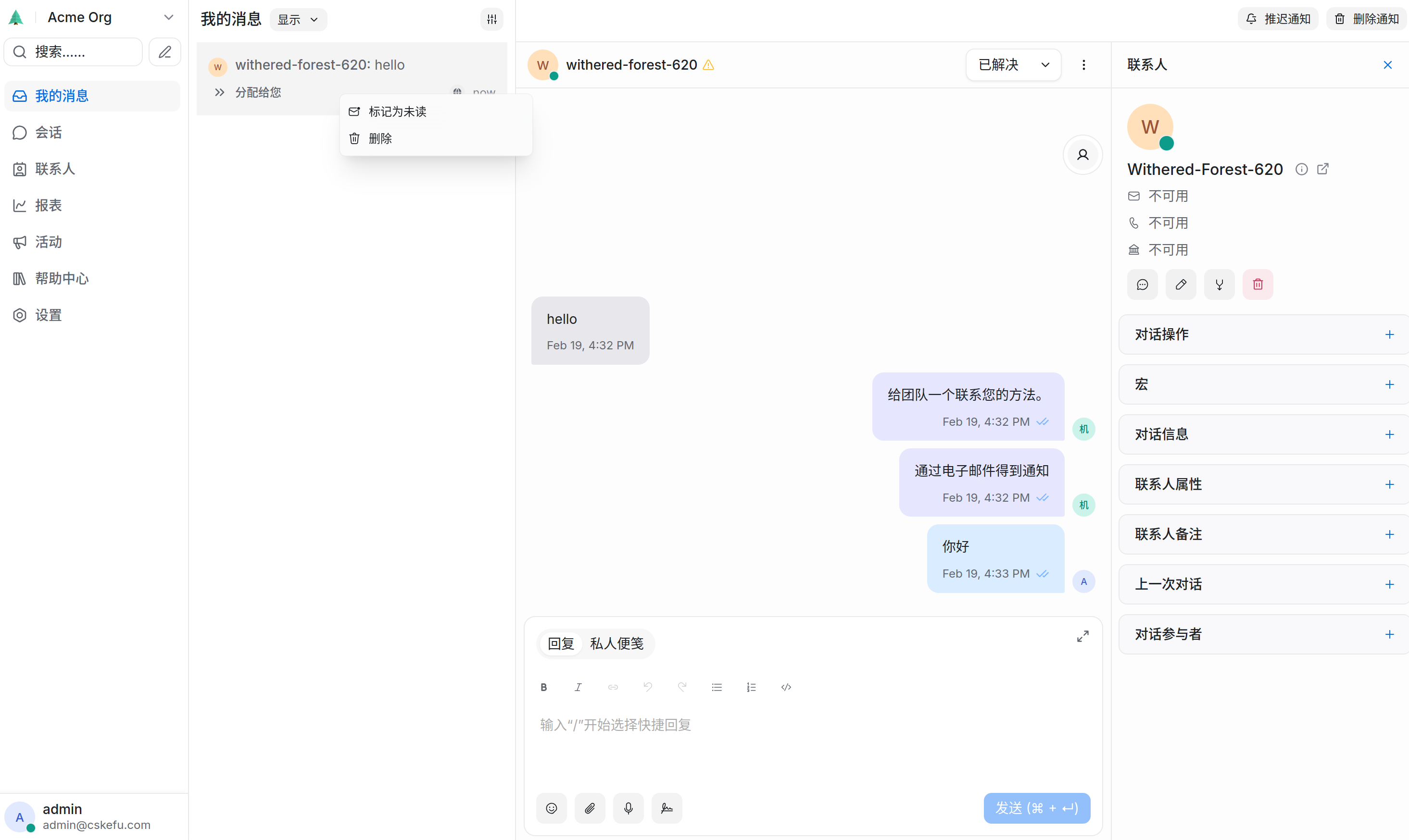 - 指派/转接: 可以将对话手动分配给特定坐席,或从一个团队(如销售)转交给另一个团队(如技术)。