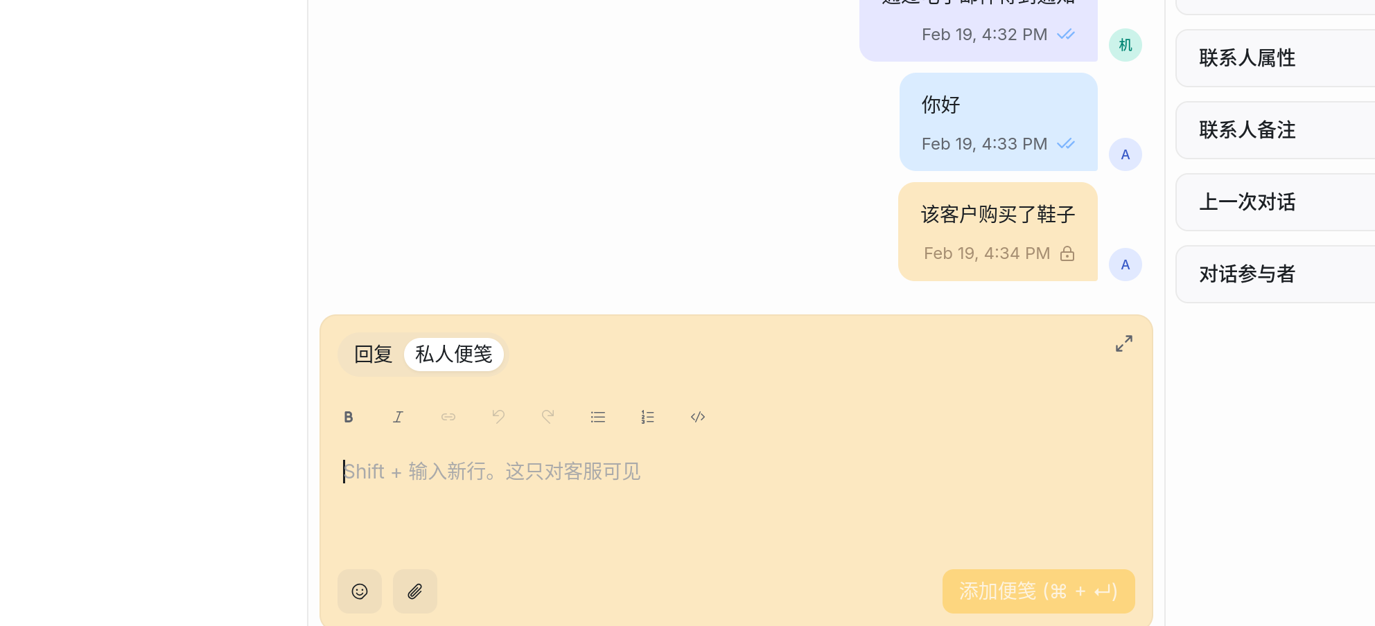 - 私密便签 (Private Notes): 聊天框可以切换到“便签”模式(背景变黄)。你在这里发送的消息客户看不见。可以用来记录备注或